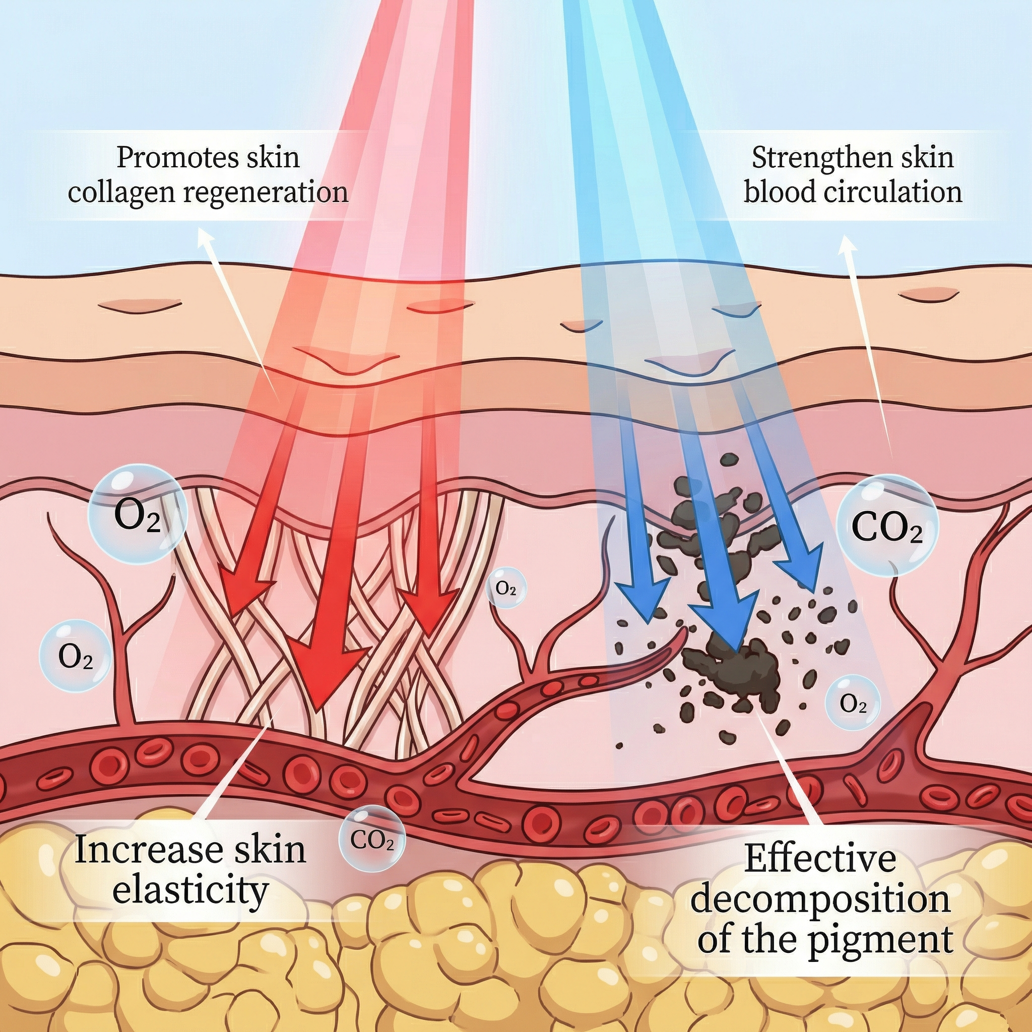 Yellow light(590nm): Decomposes pigments, detoxifies lymph nodes & improves roughness