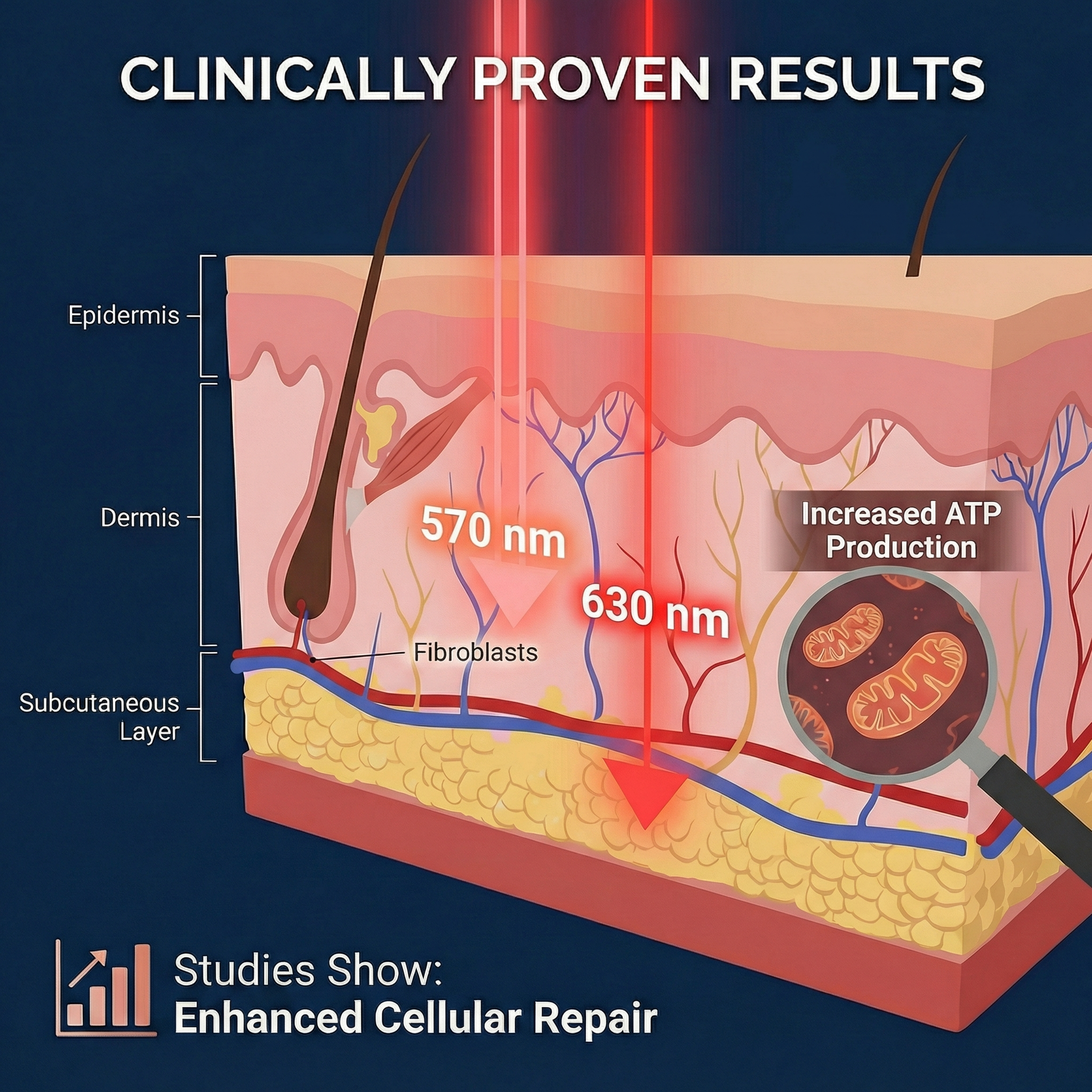 Studies show that 570 and 630 nanometer red and near-infrared light wavelengths can travel several millimeters beneath the skin’s surface. When this light reaches your skin cells, it helps increase the production of the energy your cells use to repair and renew themselves.